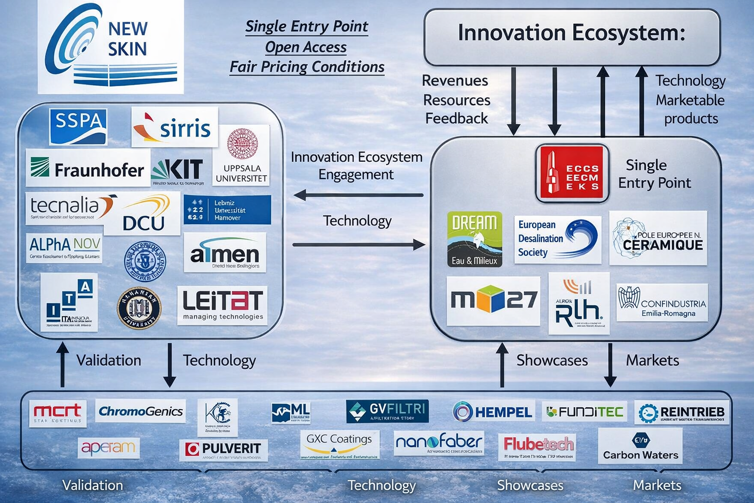 | 16 | European Union’s Horizon 2020 Research and Innovation Programme Grant Agreement | Nr. 862100 2020-2024 | NewSkin INNOVATION ECOSYSTEM TO ACCELERATE THE INDUSTRIAL UPTAKE OF ADVANCED SURFACE NANO-TECHNOLOGIES https://www.newskin-oitb.eu ![]() | 1. CONVENTION EUROPEENNE DE LA CONSTRUCTION METALLIQUE ASBL (BE) 2. FRAUNHOFER GESELLSCHAFT ZUR FORDERUNG DER ANGEWANDTEN FORSCHUNG EV (DE) 3. GOTTFRIEDWILHELM LEIBNIZ UNIVERSITAET HANNOVER (DE) 4. KARLSRUHER INSTITUT FUER TECHNOLOGIE (DE) 5. UPPSALA UNIVERSITET (SE) 6. SSPA SWEDEN AB (SE) 7. DUBLIN CITY UNIVERSITY (IE) 8. TECHNION – ISRAEL INSTITUTE OF TECHNOLOGY (IL) 9. SIRRIS HET COLLECTIEF CENTRUM VAN DE TECHNOLOGISCHE INDUSTRIE (BE) 10. ASOCIACION DE INVESTIGACION METALURGICA DEL NOROESTE (ES) 11. FUNDACION TECNALIA RESEARCH & INNOVATION (ES) 12. FUNDACION TECNOLOGICA ADVANTX (ES) 13. INSTITUTO TECNOLOGICO DE ARAGON (ES) 14. ACONDICIONAMIENTO TARRASENSE ASSOCIACION (ES) 15. CONFINDUSTRIA EMILIA AREA CENTRO, LE IMPRESE DI BOLOGNA, FERRARA E MODENA (IT) 16. INSPIRALIA GMBH (AT) 17. POLE DREAM EAU ET MILIEUX (FR) 18. ASSOCIATION POUR LE DEVELOPPEMENT ET LA PROMOTION DU POLE EUROPEEN DELA CERAMIQUE (FR) 19. ASSOCIATION LASER PHOTONIQUE HYPERFREQUENCES & APPLICATIONS (FR) 20. EUROPEAN DESALINATION SOCIETY (IT) 21. KEMICA COATINGS (FR) 22. FLUBETECH S.L. (ES) 23. SC MGM STAR CONSTRUCT SRL (RO) 24. CARBON WATERS SAS (FR) 25. PULVERIT POLSKA SPOLKA Z OGRANICZONA ODPOWIEDZIALNOSCIA (PL) 26. GXC COATINGS GMBH (DE) 27. ALBANIAN UNIVERSITY CENTER (AL) 28.CENTRE TECHNOLOGIQUE ALPHANOV (FR) 29. ML ENGRAVING SRL (IT) 30. REINTRIEB GMBH (AT) 31. PINTURAS HEMPEL SA (ES) 32. NANOFABER SRL (IT) 33. GV FILTRI INDUSTRIALI SRL (IT) 34. CHROMOGENICS AB (SE) 35. APERAM STAINLESS FRANCE SASU (FR) 36. AQUA TT UETP COMPANY LIMITED BY GUARANTEE (IE) 37. RISE RESEARCH INSTITUTES OF SWEDEN AB (SE) 38. REAGENT CHEMICAL SERVICES LIMITED (UK) |